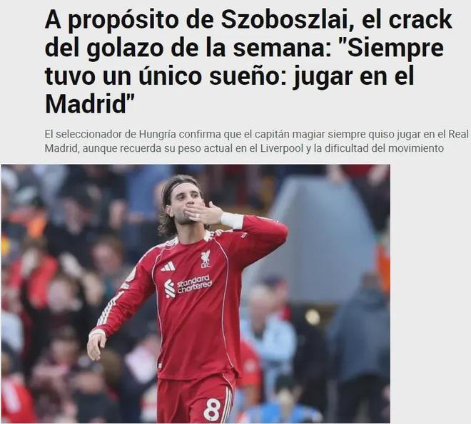 匈牙利主帥羅西近日表示,索博斯洛伊的夢想是為皇馬效力,而馬卡報表示這個言論已經(jīng)引起了銀河戰(zhàn)艦的關(guān)注。